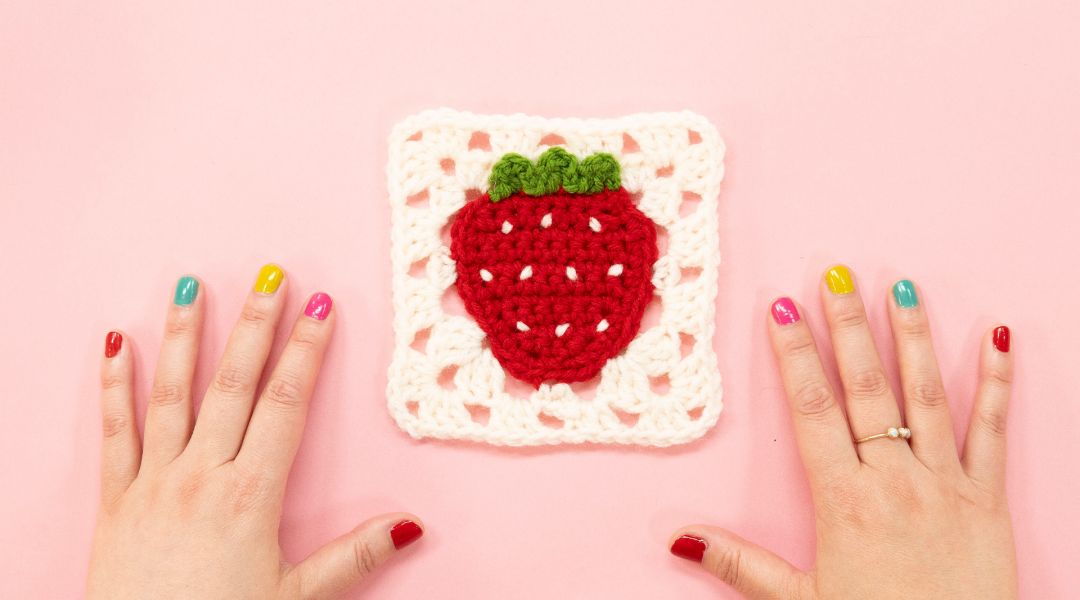 There is a whole world of granny squares out there with fun shapes like fruits and veggies and animals inside them. Crochet a super cute strawberry granny square with crochet designer Twinkie Chan. Learn how to create a strawberry shape in rows and how to build a granny square around it. Then, top the strawberry with a row of leaves and stitch on the seeds. In this little five-inch square you’ll get to practice crochet stitches of many heights, from single crochet up to treble crochet, and you’ll have the sweetest addition to your granny square collection.