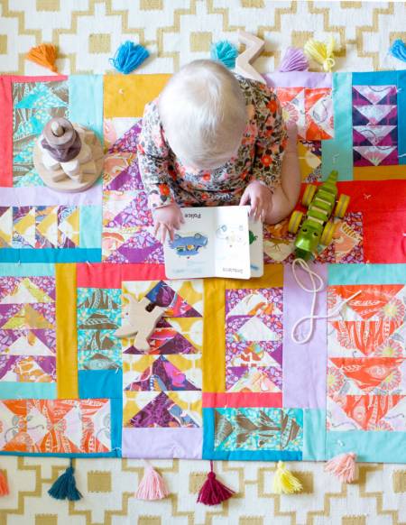 This is the traditional Flying Geese design with a fresh spin, turning it into a baby quilt with Flying Gosling blocks. Use the no-waste method, add bright wool tassels around the edges, and hand-tie the quilt to finish.