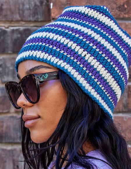 This striped crocheted hat features unique shaping that adds a playful twist to its classic design. Find your Patons Yarns here.