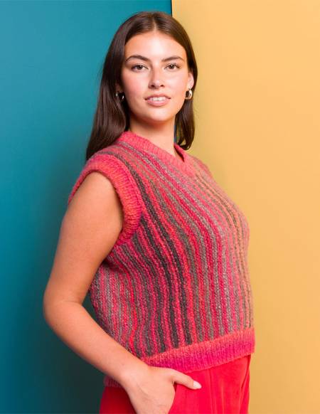 This knit vest is surprisingly simple but visually dazzling thanks to alternating stripes of Caron's Colorama Haze yarn.