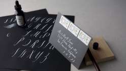 In Part 3, let’s switch things up by practicing with white ink on black paper. Since you won’t be able to use a guide sheet with black paper, this exercise helps you get comfortable with free-hand calligraphy and will loosen up your style. You’ll also learn how to write numerals and punctuation, which we’ll use together with letters to beautifully address an envelope.