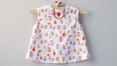 This eensy blouse is loaded with charming details, including the front tab and the back button placket. The clean lines of the design mean this blouse will work with any fabric – including lively prints. Heather designed this for her daughter, and the love shows – with a facing that adds a finished touch and shows off a corresponding print, and the pops of color throughout. The pattern comes in three sizes: 12, 18, and 24 months.