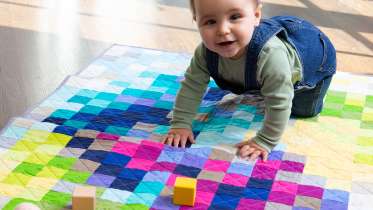 Anna Maria Horner puts a fresh spin on the traditional Flying Geese design with this baby quilt. Anna Maria uses the no-waste method to create her Flying Gosling blocks, explaining how to choose light and dark fabrics to add depth to each block. She also shows you how to improvise your layout on a design wall, add bright wool tassels around the edges, and hand-tie the quilt to finish.