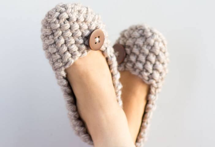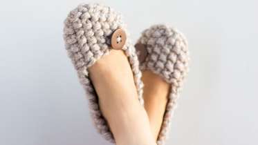 Whip up a pair of cozy slippers in no time at all using bulky yarn and large knitting needles. Worked in a nubby Seed Stitch pattern, these slippers come together quickly and are topped off with a cute button accent. This satisfying project is great for beginning knitters who want to practice shaping and stitch patterns, as well as seasoned knitters who simply want a break from a bigger project.