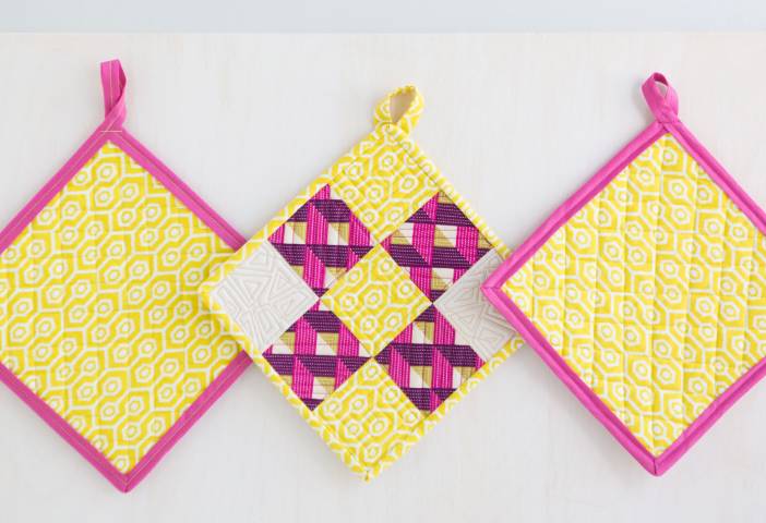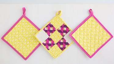 Dip your toe into the wild waters of quilting with these two simple potholder projects. Modern quilter Ashley Nickels shows you how to make a basic potholder using solid squares of fabric and pre-made bias tape, or a slightly more complex patchwork potholder using homemade binding tape. You will learn about basting, chain piecing and different styles of quilting, plus pro tips for attaching the binding.