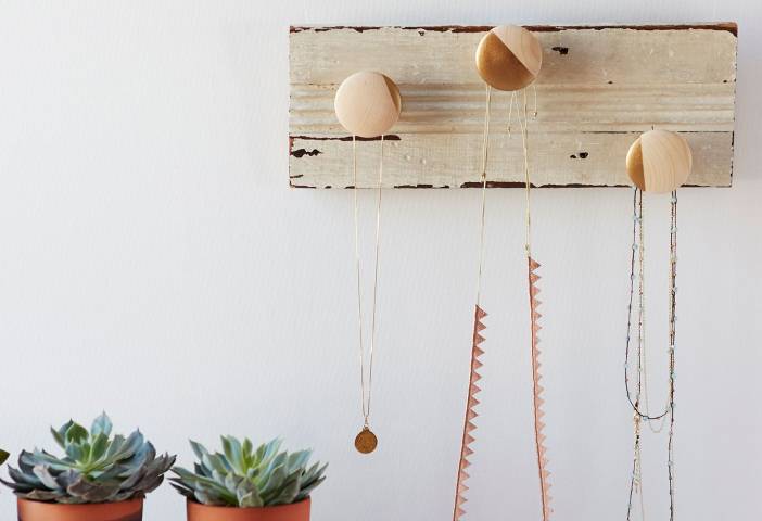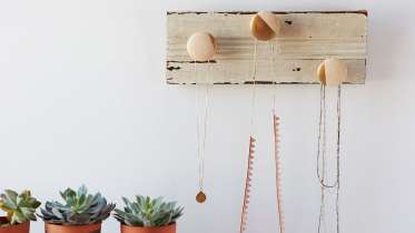 Pro furniture refinisher Barb Blair teaches you how to create a sweet accessory rack out of found wood and drawer knobs. This project only takes a few minutes to make, but the resulting rack will hang on your wall for years and years to come. It’s perfect for hanging scarves and necklaces, and it’s easy to customize the size and style with your choice of materials.