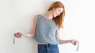 This easy, breezy top is deceptively simple to stitch. Featuring a simple double crochet paired with a mesh portion, it’s worked in two rectangles, then joined at the sides with crisscross tassel ties and seemed at the shoulders, creating a drapey boat-neck. The Wool And The Gang’s recycled Billy Jean yarn gives this top great body and drape, and the clear instructions and straightforward pattern are accessible to even the newest of beginners. This top comes together quickly and is sure to become a summer staple.